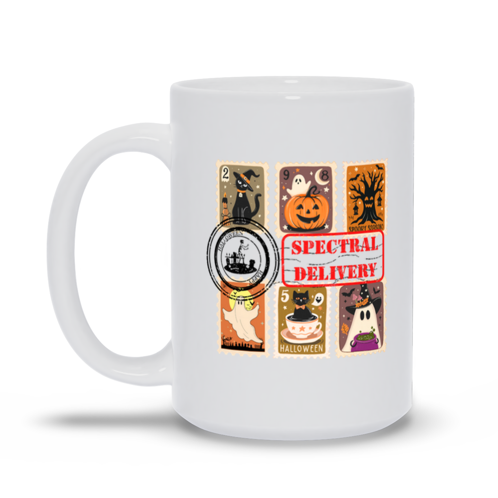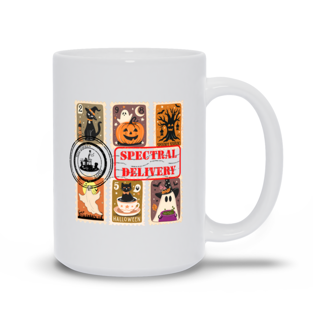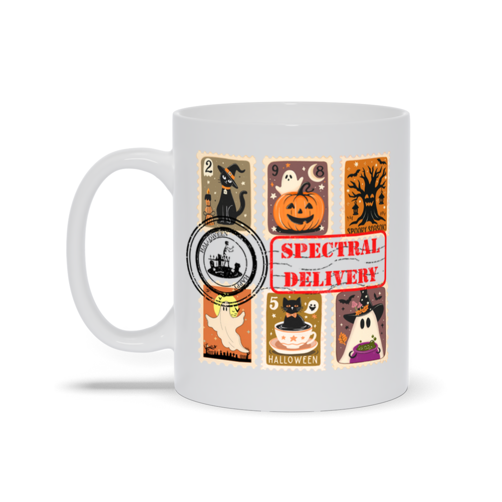 Spectral Delivery Halloween Mug – Cute Stamp-Themed Ghost & Cat Coffee Cup