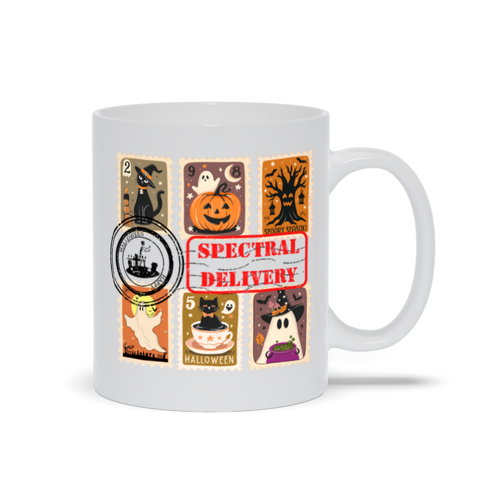 Send your Halloween vibes via Spectral Delivery! This mug features a cute grid of Halloween postage stamps—each with its own spooky charm. From floating ghosts to witchy black cats, it’s a retro Halloween dream for coffee and tea lovers, stamp collectors, and cozy fall vibes.
